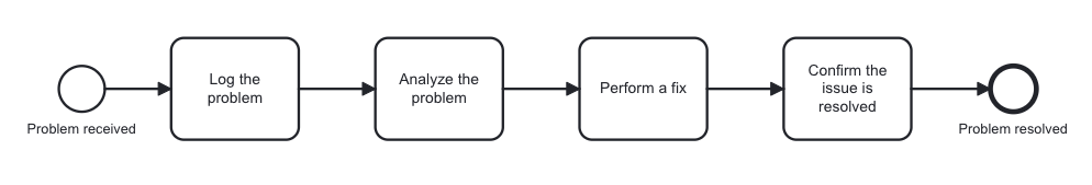 Then we carry out a set of activities to solve the problem, either sequentially or in parallel. For example, we log the problem, analyze it, check the history or systems, perform a fix, and confirm that the issue is resolved. These are our process activities or tasks.