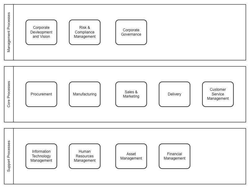 Usually we have 3 process categories: Core or operational processes, Management processes, and Support processes. In some references, the management and support processes are combined into one category.